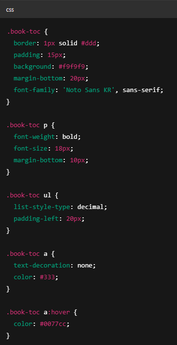- CSS 스타일 코드: 목차 영역의 디자인 설정