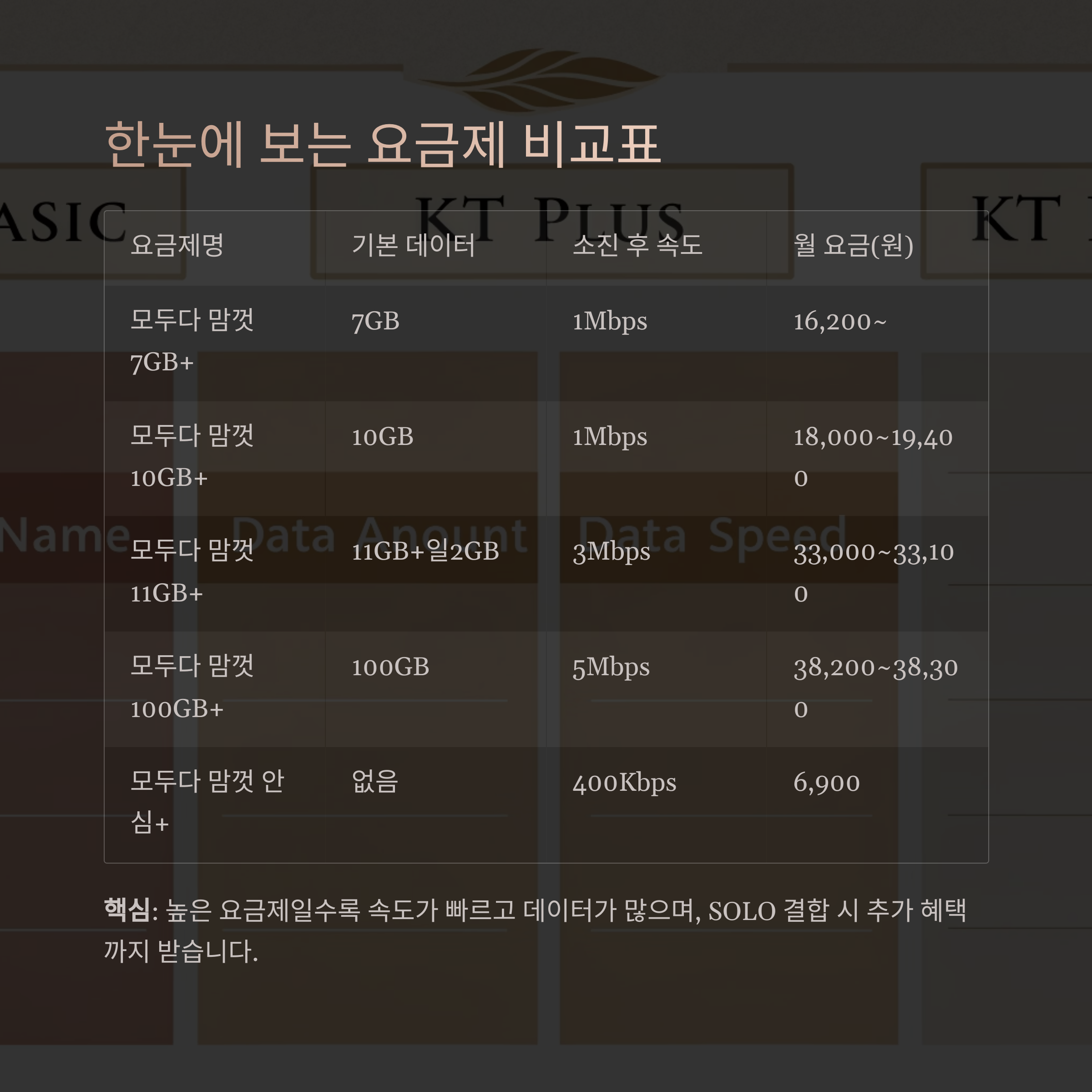 핵심: 높은 요금제일수록 속도가 빠르고 데이터가 많으며, SOLO 결합 시 추가 혜택까지 받습니다.