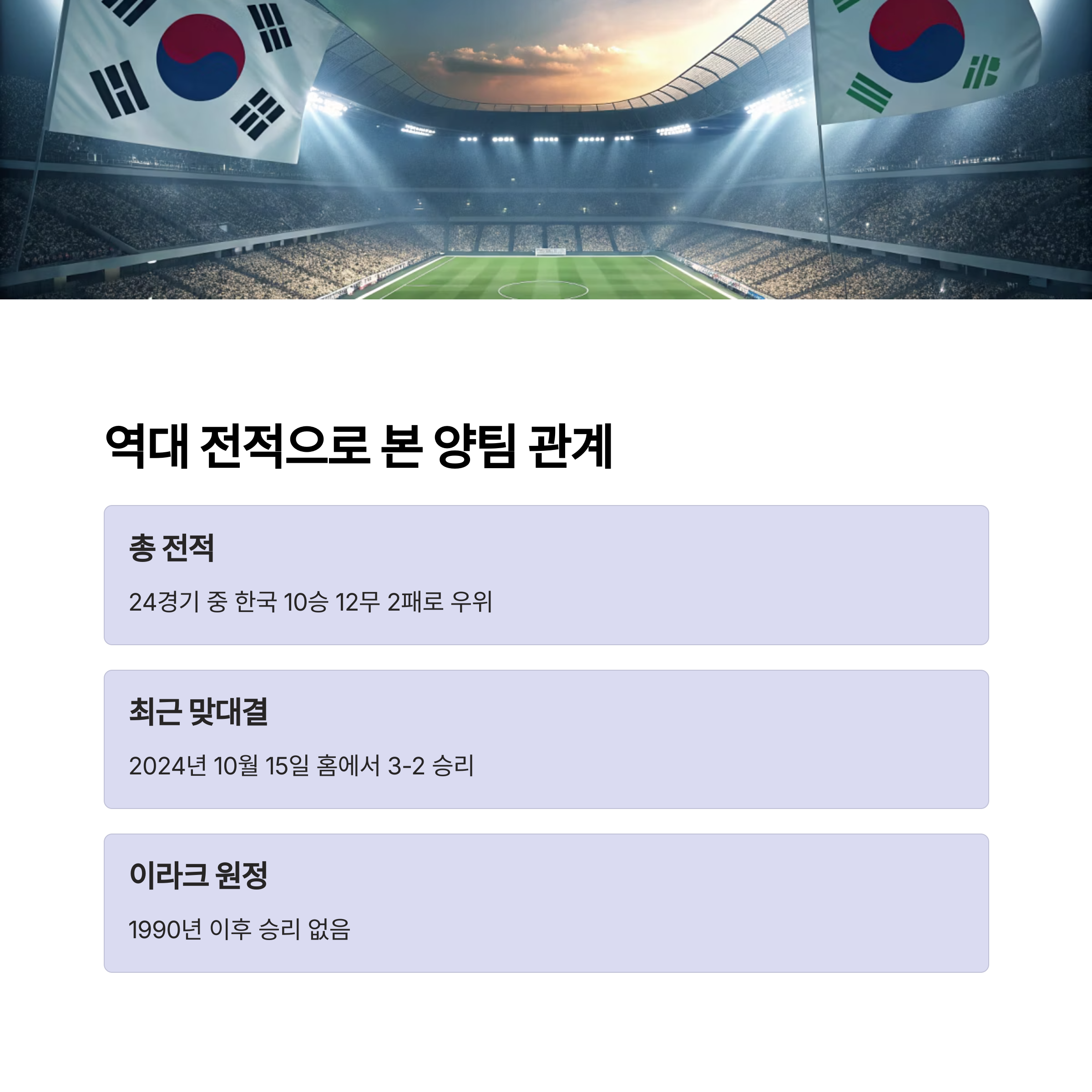 양팀은 역대 24번 맞붙은 기록에서 대한민국이 10승 12무 2패로 압도적 우위를 점하고 있습니다. 특히 최근 3차 예선 1차전(2024년 10월 15일)에서 대한민국은 홈에서 3-2 승리를 거두며 기선을 제압한 바 있습니다. 그러나 이라크 원정에서의 승리는 1990년 이후 단 한 번도 없었으며, 2007년 아시안컵 준결승에서 승부차기 패배를 겪은 아픈 역사도 있습니다.
