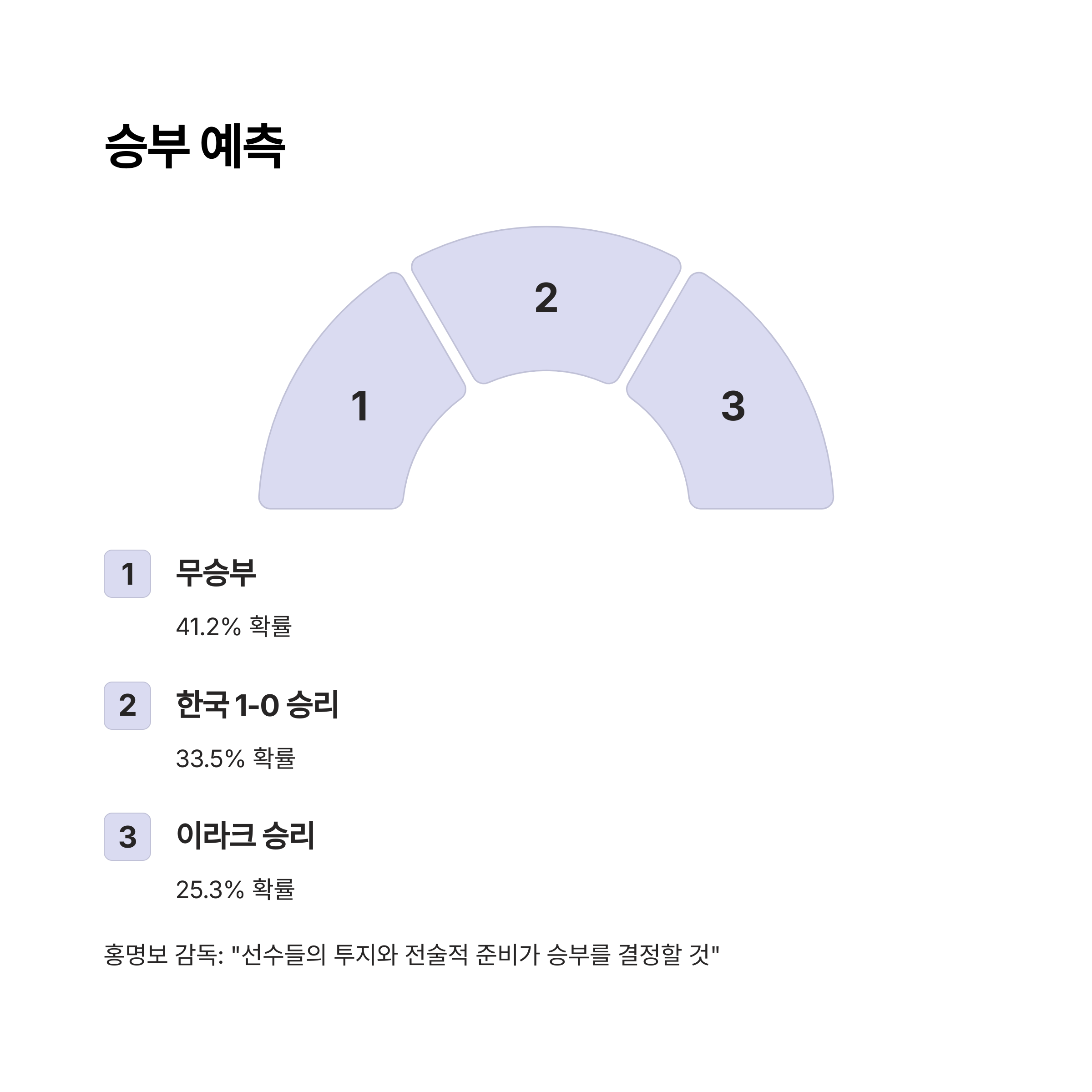 대한민국의 객관적 전력 우위에도 불구하고, 이라크의 홈 어드밴티지와 혹서는 변수로 작용할 수 있습니다. 그러나 홍명보 감독은 "선수들의 투지와 전술적 준비가 승부를 결정할 것"이라며 자신감을 표했습니다. 주요 축구 분석가들은 대한민국의 무승부(41.2%) 또는 1-0 승리(33.5%)를 점치고 있습니다.