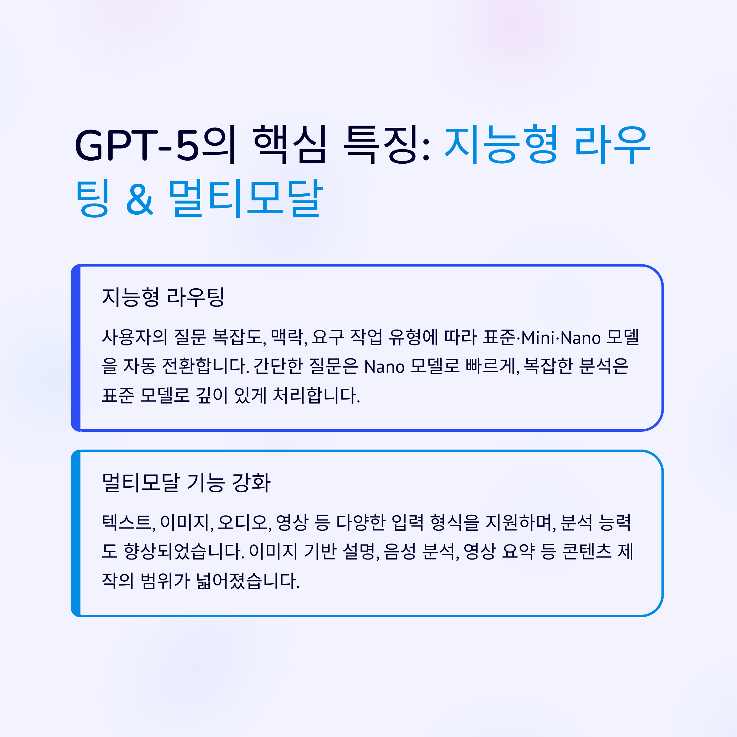GPT-5는 사용자의 질문 복잡도, 맥락, 요구 작업 유형에 따라 표준·Mini·Nano 모델을 자동 전환합니다.