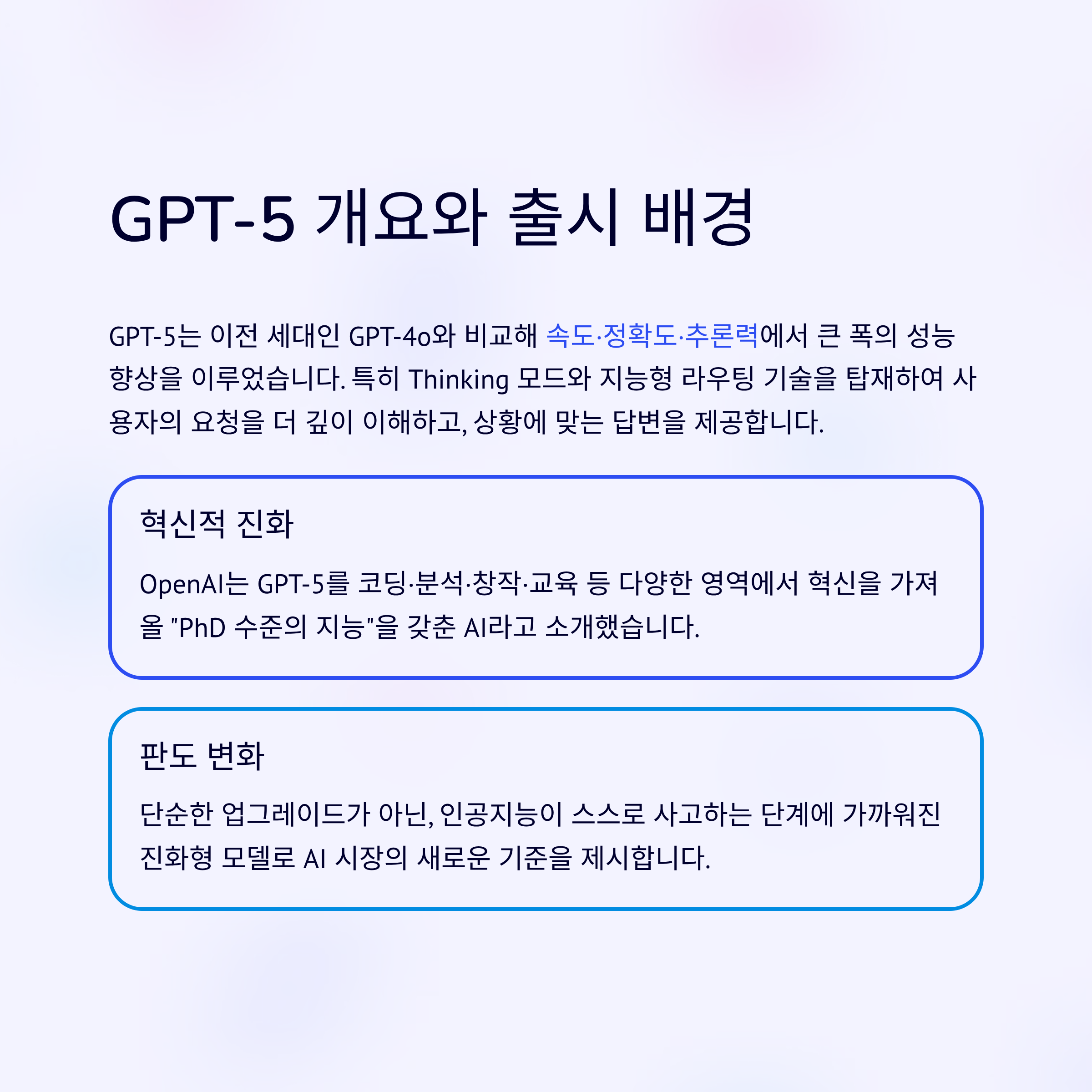 GPT-5는 단순한 업그레이드가 아니라, 인공지능이 스스로 사고하는 단계에 가까워진 진화형 모델입니다.