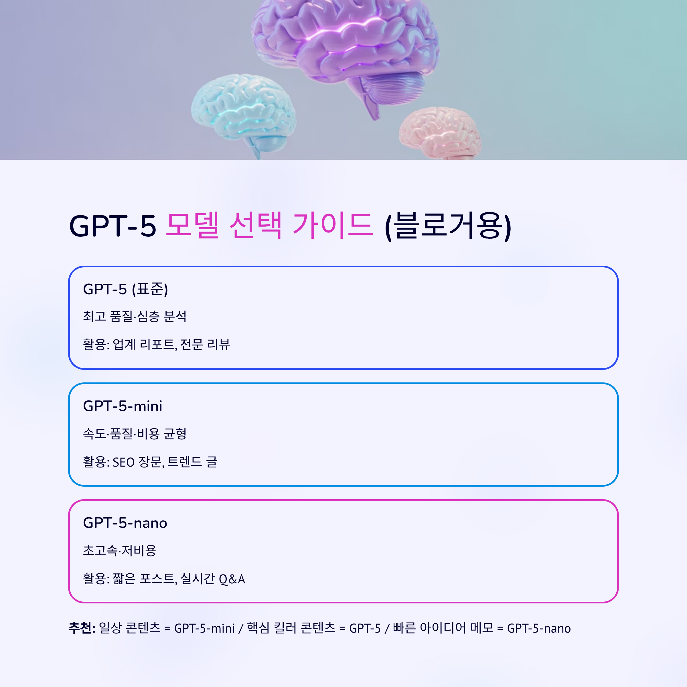 | GPT-5-mini | 속도·품질·비용 균형 | SEO 장문, 트렌드 글 |