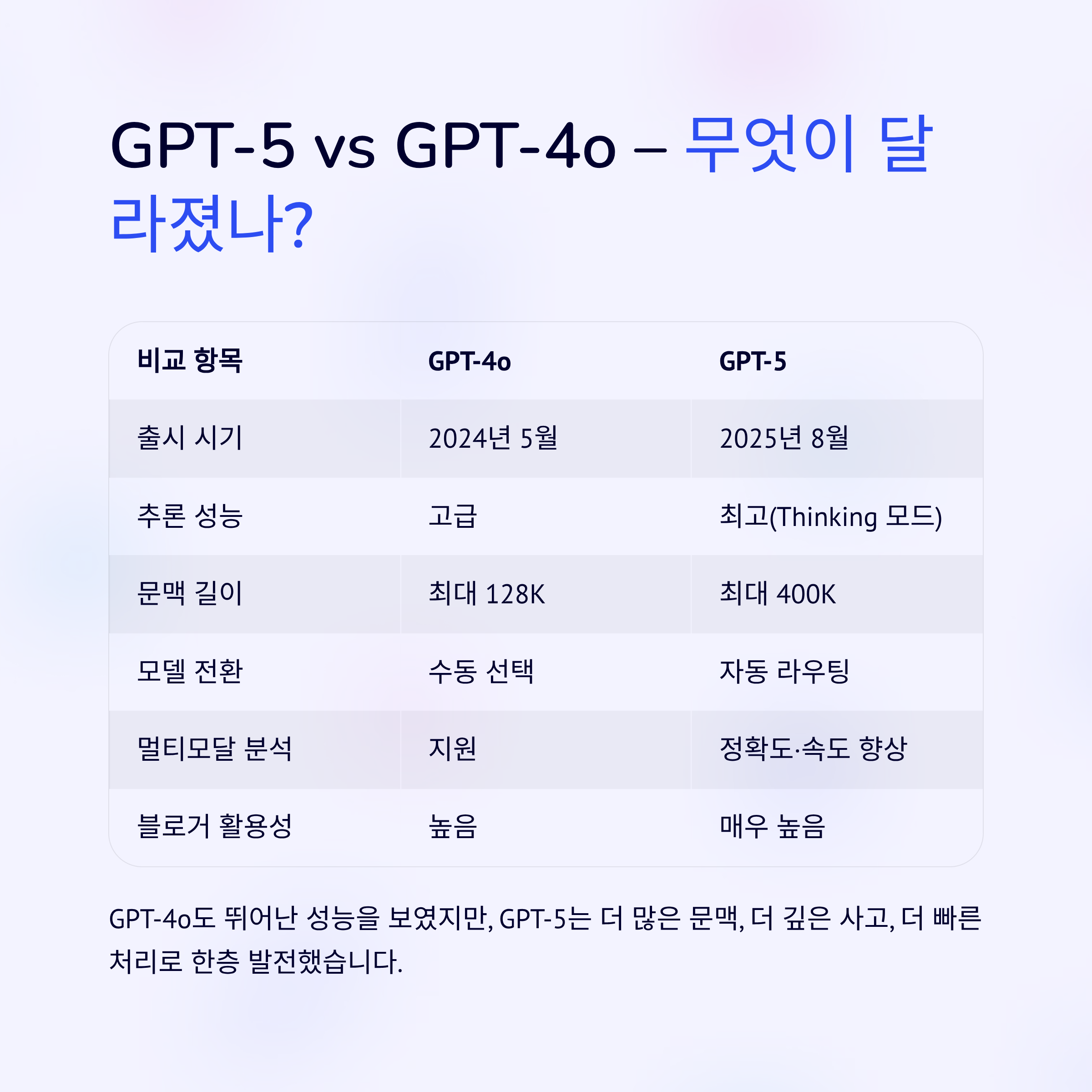 GPT-4o도 뛰어난 성능을 보였지만, GPT-5는 더 많은 문맥, 더 깊은 사고, 더 빠른 처리로 한층 발전했습니다.