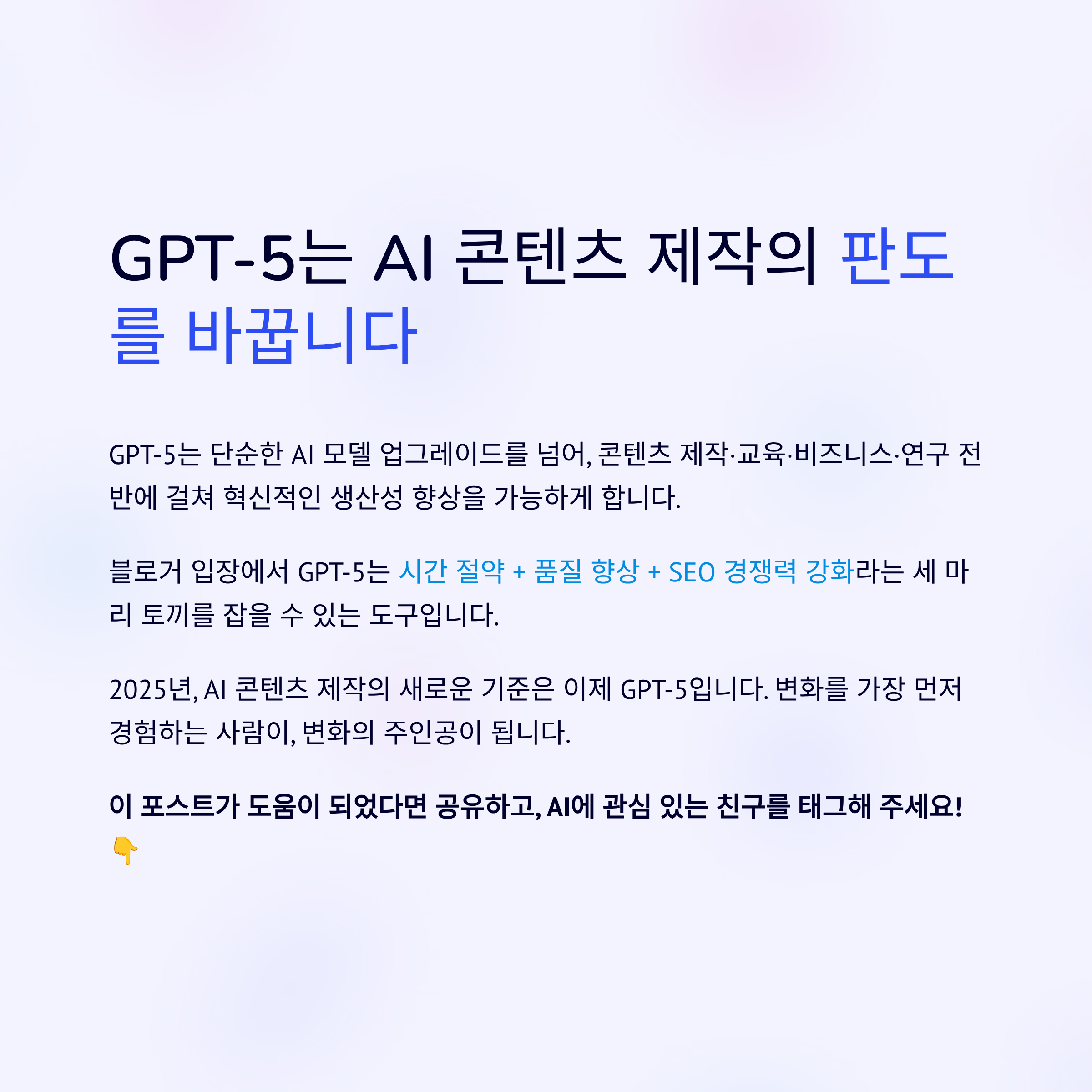 블로거 입장에서 GPT-5는 시간 절약 + 품질 향상 + SEO 경쟁력 강화라는 세 마리 토끼를 잡을 수 있는 도구입니다.